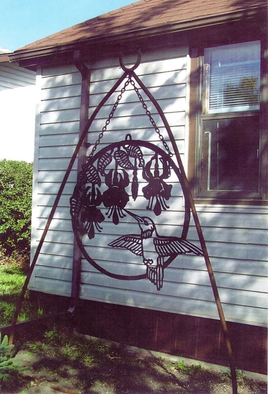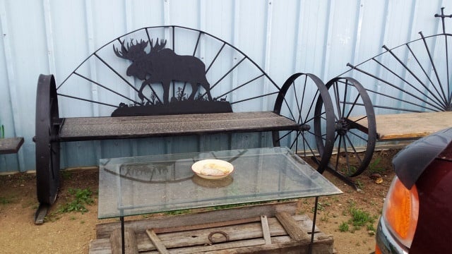 He’s used tractor seats, wagon wheels, horseshoes, an anvil, the silhouette of a family at a rodeo and much more.