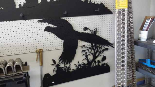 Mike uses a hand controlled plasma cutter to create metal signs and artwork. "I use recycled materials whenever possible. Sometimes people have material that they want to incorporate into the design. In one situation a family had the reins from their original horse team incorporated into the design."